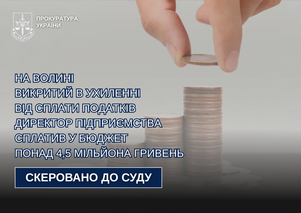 У ході досудового розслідування кримінального провадження про умисне ухилення суб'єктом господарювання від сплати податків у значних розмірах (ч.1 ст. 212 КК України), прокурори забезпечили відшкодування заподіяної державному бюджету шкоди у сумі понад 4,5 млн гривень.