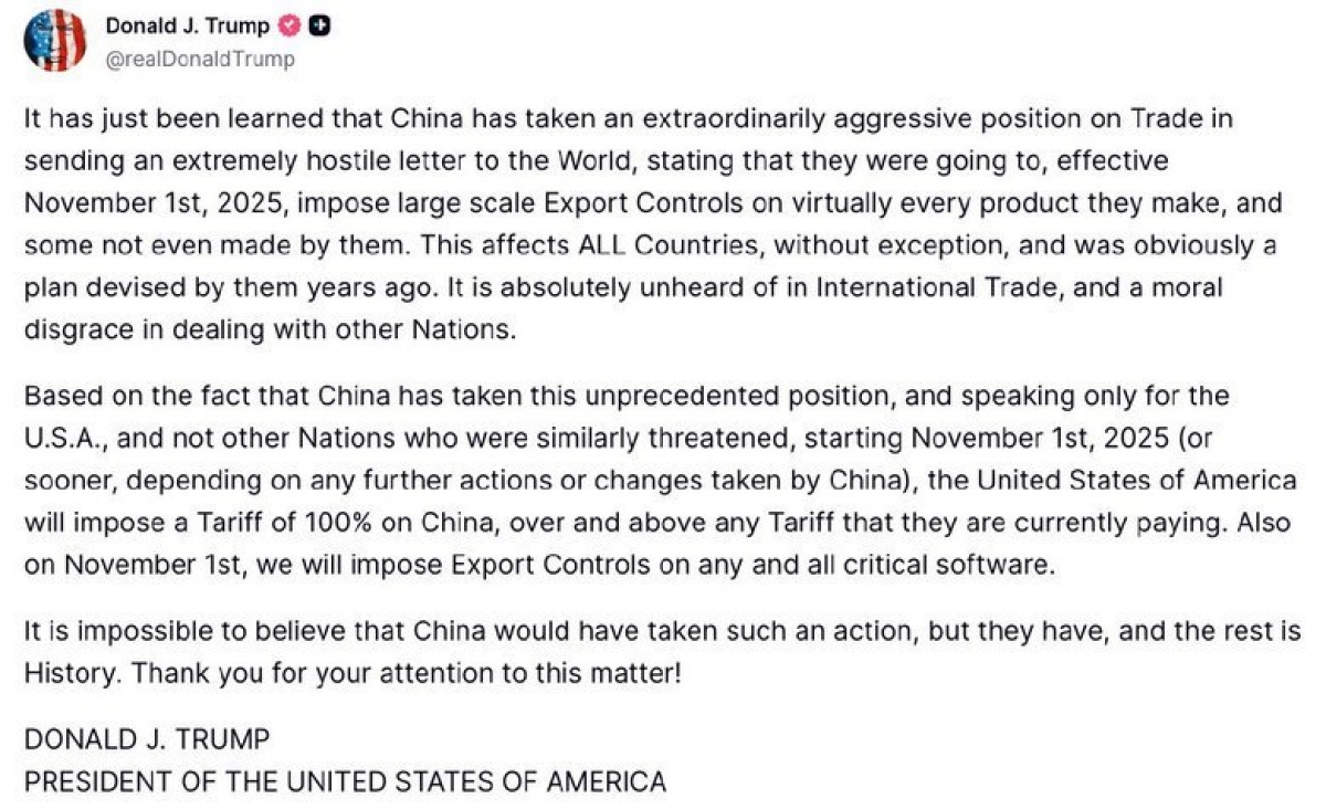 "Щойно стало відомо, що Китай зайняв надзвичайно агресивну позицію в питаннях торгівлі, надіславши всьому світу надзвичайно ворожий лист, в якому заявив, що з 1 листопада 2025 року він запровадить масштабний експортний контроль практично на всі товари, які він виробляє, а також на деякі товари, які навіть не виробляються ним. Це стосується всіх країн без винятку і, очевидно, є планом, розробленим ними ще кілька років тому. Це абсолютно нечуване в міжнародній торгівлі і є моральною ганьбою у відносинах з іншими країнами", - заявив очільник США.