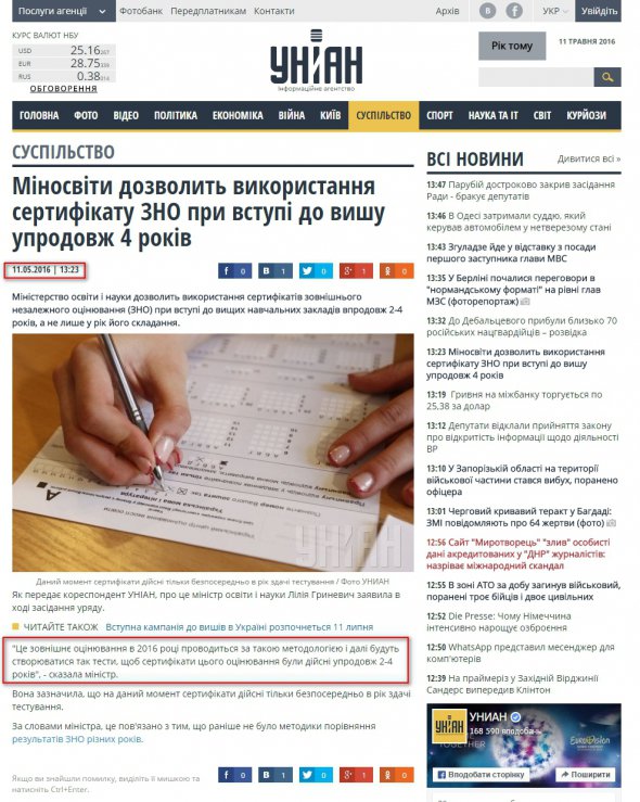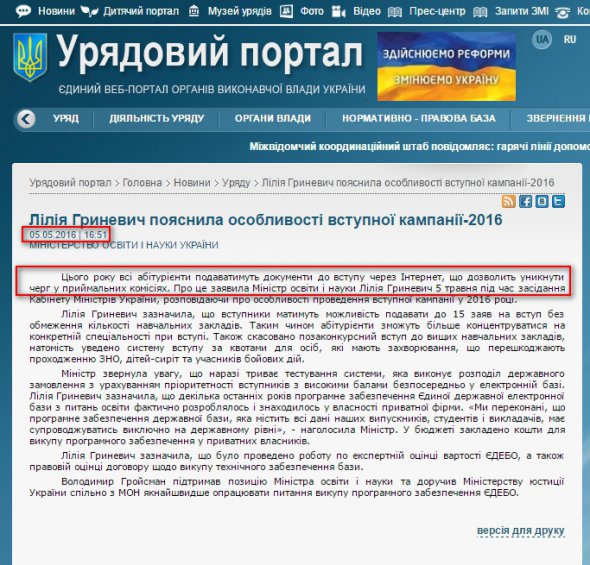 5 травня 2016 року міністр освіти Лілія Гриневич заявила, що з 2016 року всі абітурієнти подаватимуть документи до вступу через інтернет, щоб уникнути черг у приймальних комісіях.