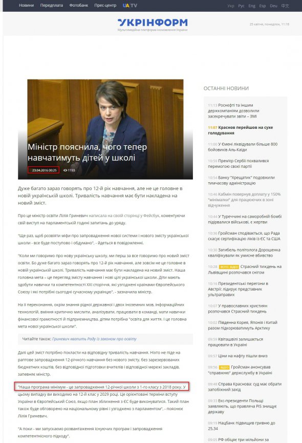 23 квітня 2016 року Гриневич заявила про намір запровадити 12-річну школу з 1-го класу 2018 року.