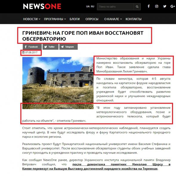 7 серпня 2017 Гриневич заявила, що в обсерваторії на горі Піп Іван встановлять нове метеорологічне обладнання.