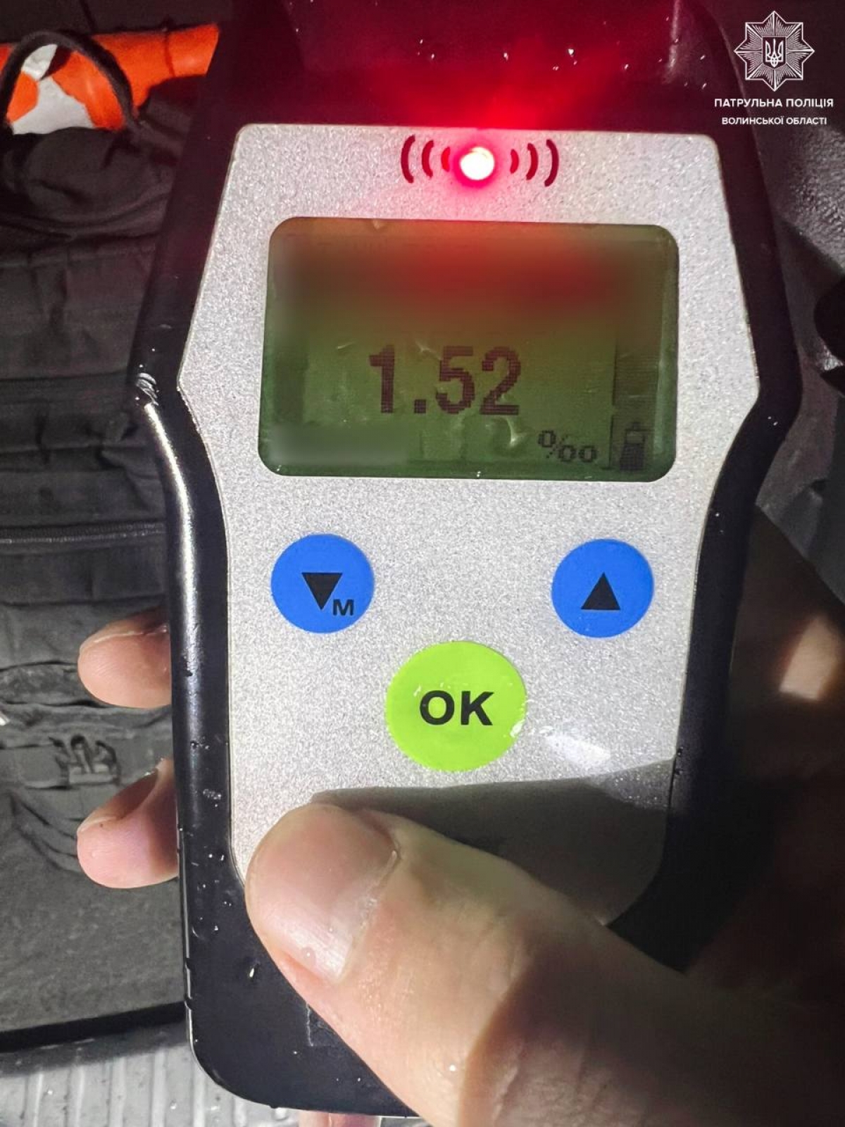 Огляд на стан сп’яніння, проведений на місці зупинки за допомогою приладу Драгер, показав результат — 1,52 проміле.