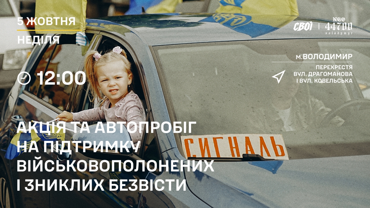 У Володимирі 5 жовтня, в неділю, о 12:00 відбудеться автопробіг та мирна акція на підтримку військовополонених та зниклих безвісти.