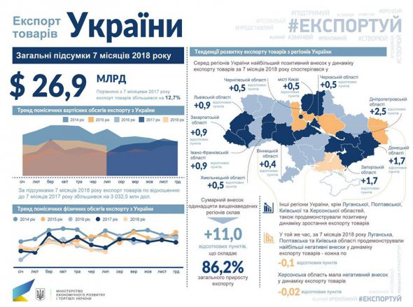 "Найбільшим торговельним партнером України залишається Європейський Союз. Його частка становить 42,1%. Експорт товарів до країн ЄС зріс на 18,7% порівняно з січнем-липнем 2017-го. Склав близько $11,3 мільярдів", - додав віце-прем'єр-міністр.