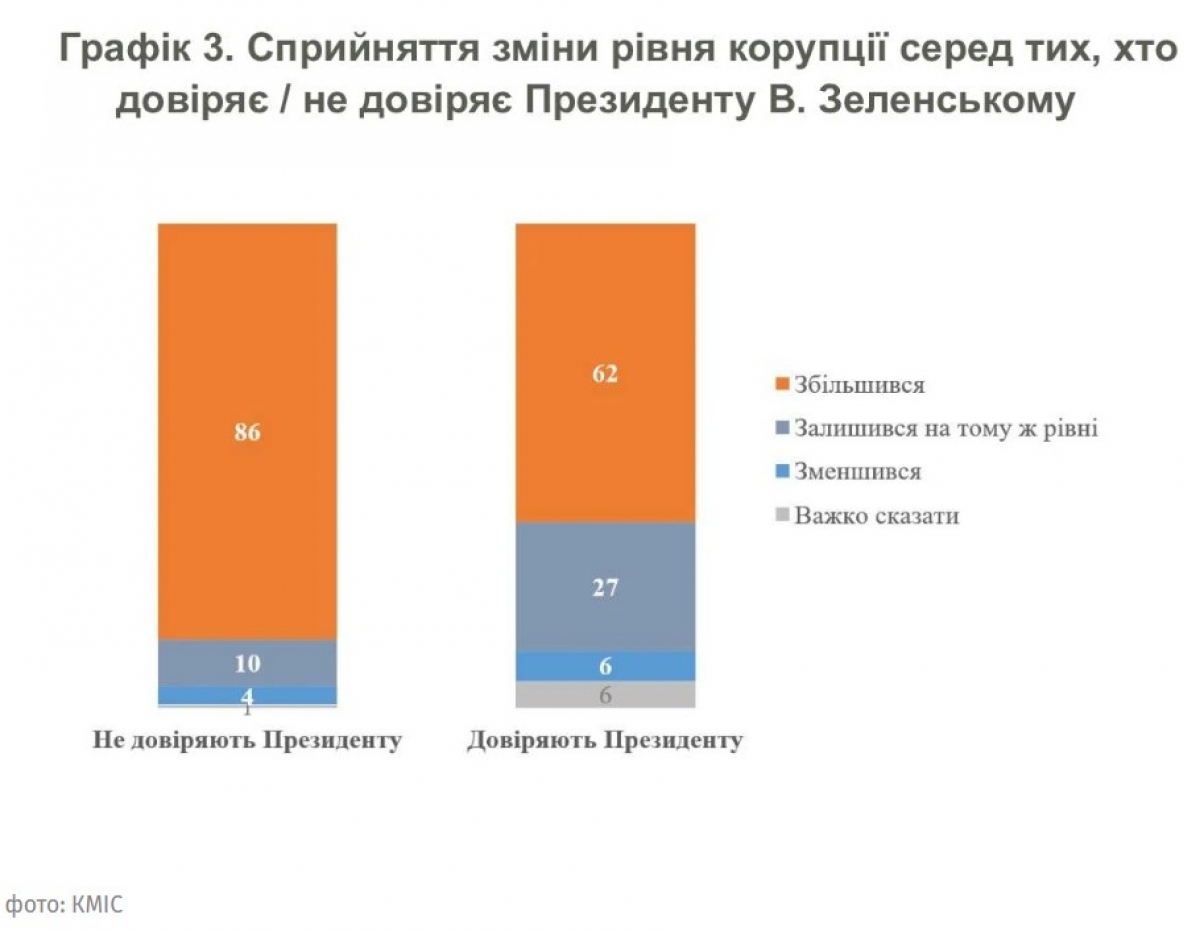 У всіх регіонах більшість респондентів відзначили зростання рівня корупції. Серед тих, хто довіряє президентові Володимиру Зеленському, також переважає переконання, що проблема посилилася під час війни.