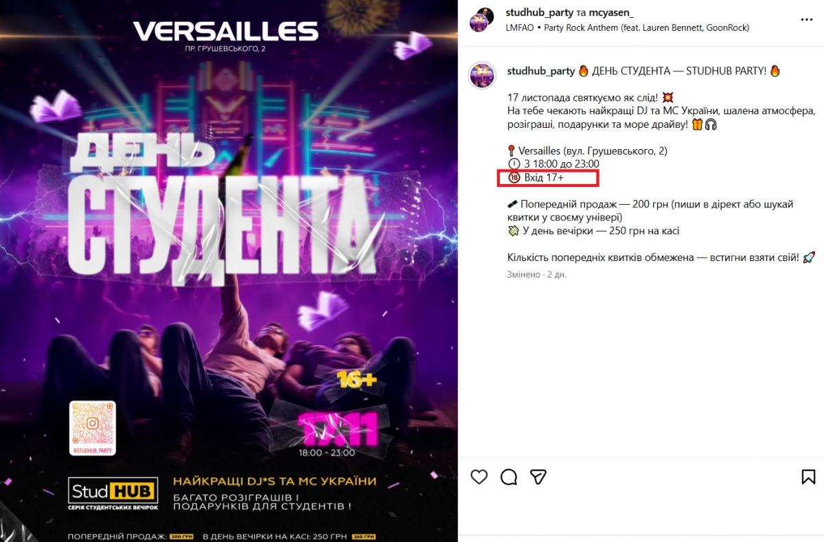 Зазначимо, на сторінці studhub_party уже з'явилася афіша святкування Дня студента 2025. Цікавий факт, що вхід 17+, проте алкоголь можна вживати з 18 років, виникає логічне запитання: як організатори вечірки контролюватимуть дотримання закону?