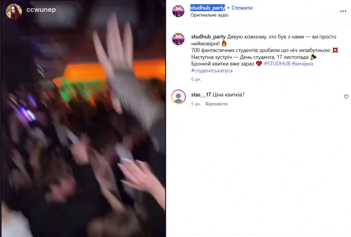 "Дякую кожному, хто був з нами — ви просто неймовірні! 700 фантастичних студентів зробили цю ніч незабутньою. Наступна зустріч — День студента, 17 листопада. Бронюй квитки вже зараз", - йдеться у дописі на сторінці studhub_party.