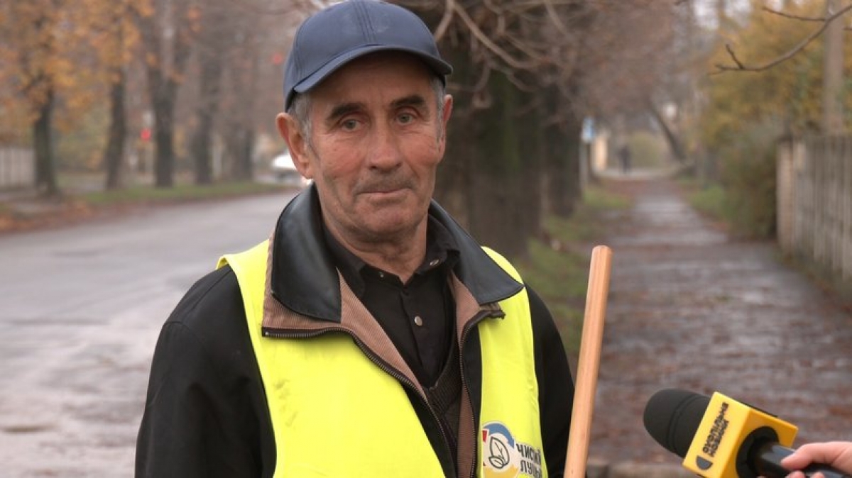 Ярослав Ралець 40 років працює двірником. Каже: листопад: найбільш "гарячий" місяць. Чоловік прибирає вулицю Потебні. З неї вже вивезли орієнтовно 10 тонн опалого листя.