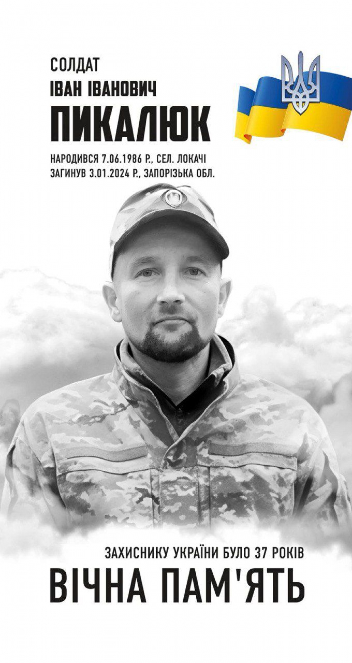 Нещодавно в Локачинську громаду надійшла страшна звістка - визнаний загиблим при виконанні службових обов'язків під час виконання бойового завдання в Запорізькій області житель селища Локачі - Пикалюк Іван Іванович.