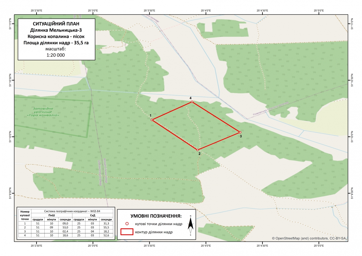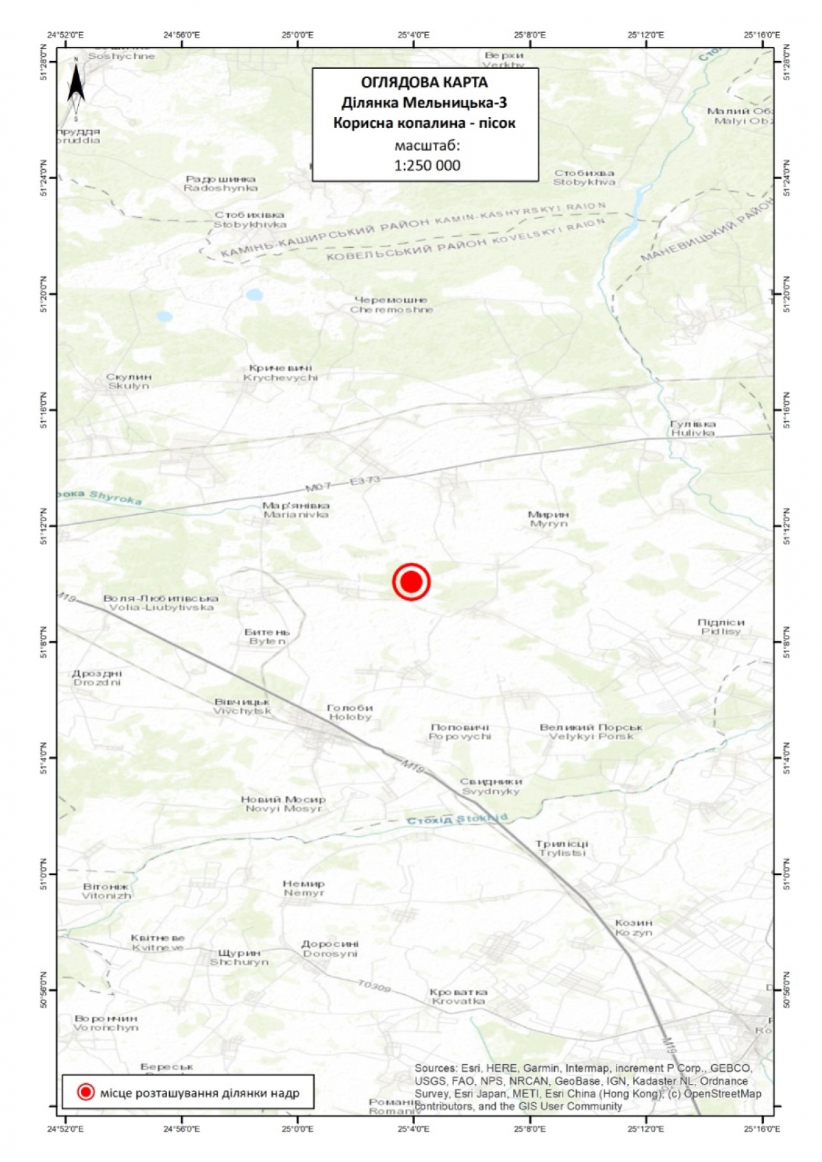 "В адміністративному відношенні ділянка Мельницька-3 розташована за 2,3 км на схід від східної околиці с. Байківці на території Ковельського району Волинської області. Вид корисної копалини: пісок. Вид користування надрами та строк, на який надається дозвіл: геологічне вивчення, у тому числі дослідно-промислова розробка, корисних копалин з подальшим видобуванням корисних копалин (промислова розробка родовищ), 20 років", - йдеться в описі лоту.