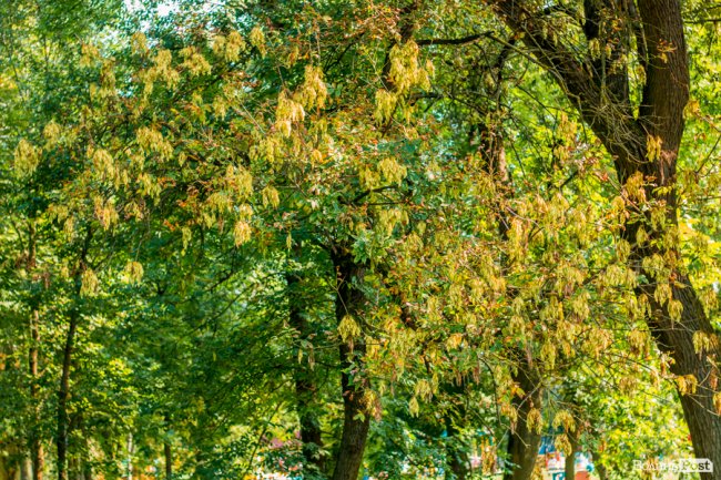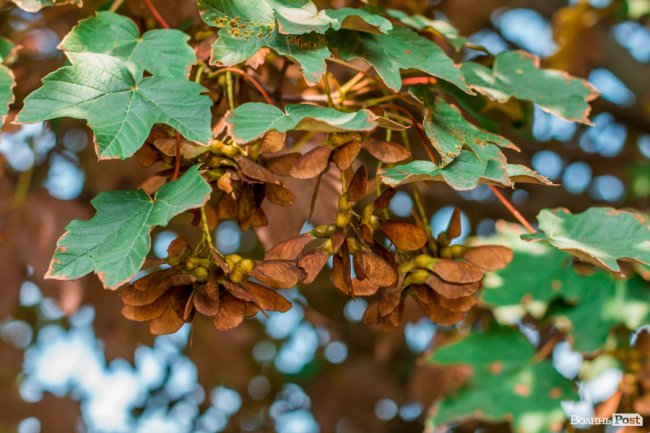 Сухі крилатки кленів спокійно висять поряд з ще зеленеми листками, а пожовклі п'ятикутні листочки не затримуються на гілках та повільно летять додолу.