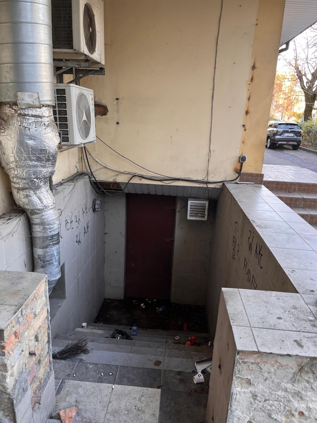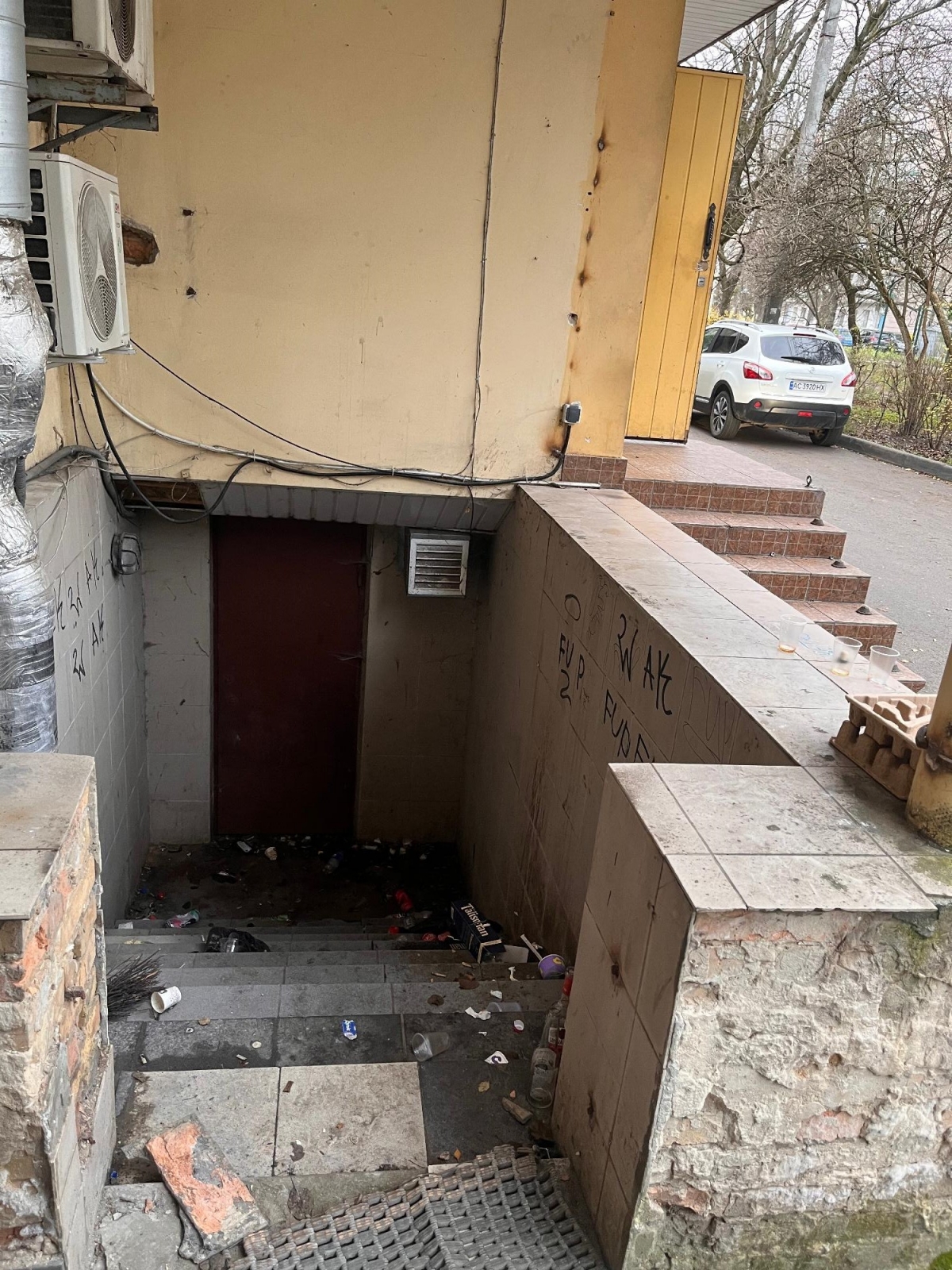 "Далі викидають сміття і розпивають алкоголь біля 1 під’їзду. Також висить кондиціонер, з якого постійно капає конденсат на стіну, все мокре, плитка і цегла відвалюються. Якщо немає якогось нормального рішення, можливо дайте мені контакти власника приміщення і ми щось придумаємо (обгородити вхід сіткою, посадити плющ), бо таке враження ніби постійно якийсь притон під під’їздом", - йдеться у дописі.
