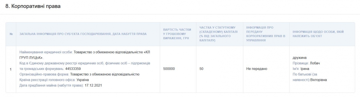 Корпоративні права Ірини Лобач на ТОВ «КЛ Груп Луцьк» підтверджені й у декларації Лобача за 2024 рік: