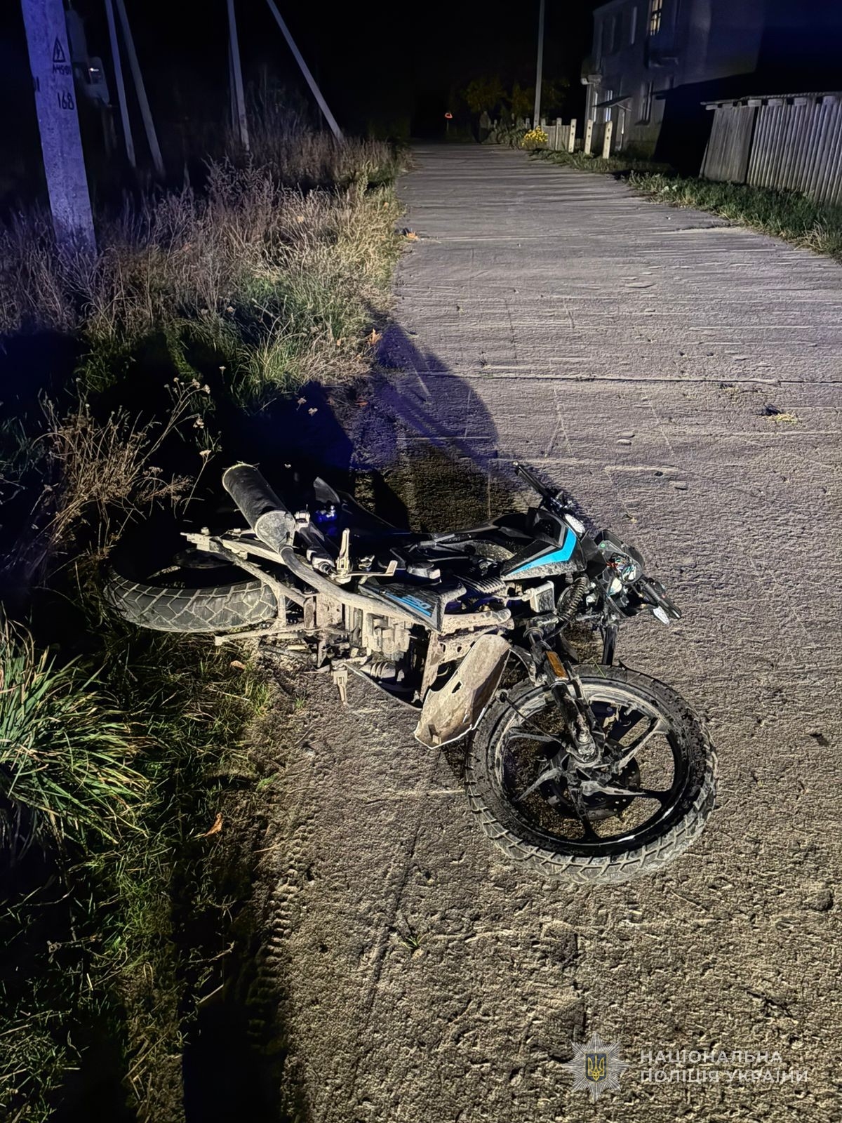 16-річний школяр, керуючи мотоциклом Geon, не вибрав безпечної швидкості, не врахував дорожньої обстановки та вʼїхав у бетонну електроопору. Хлопець від отриманих травм загинув на місці події.
