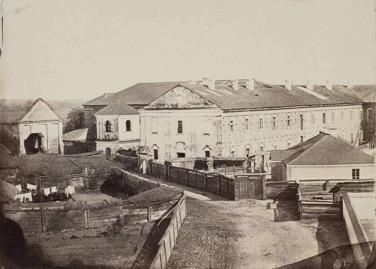 Історичне фото на якому видно, що на місці складського приміщення була дзвіниця монастиря бригідок.