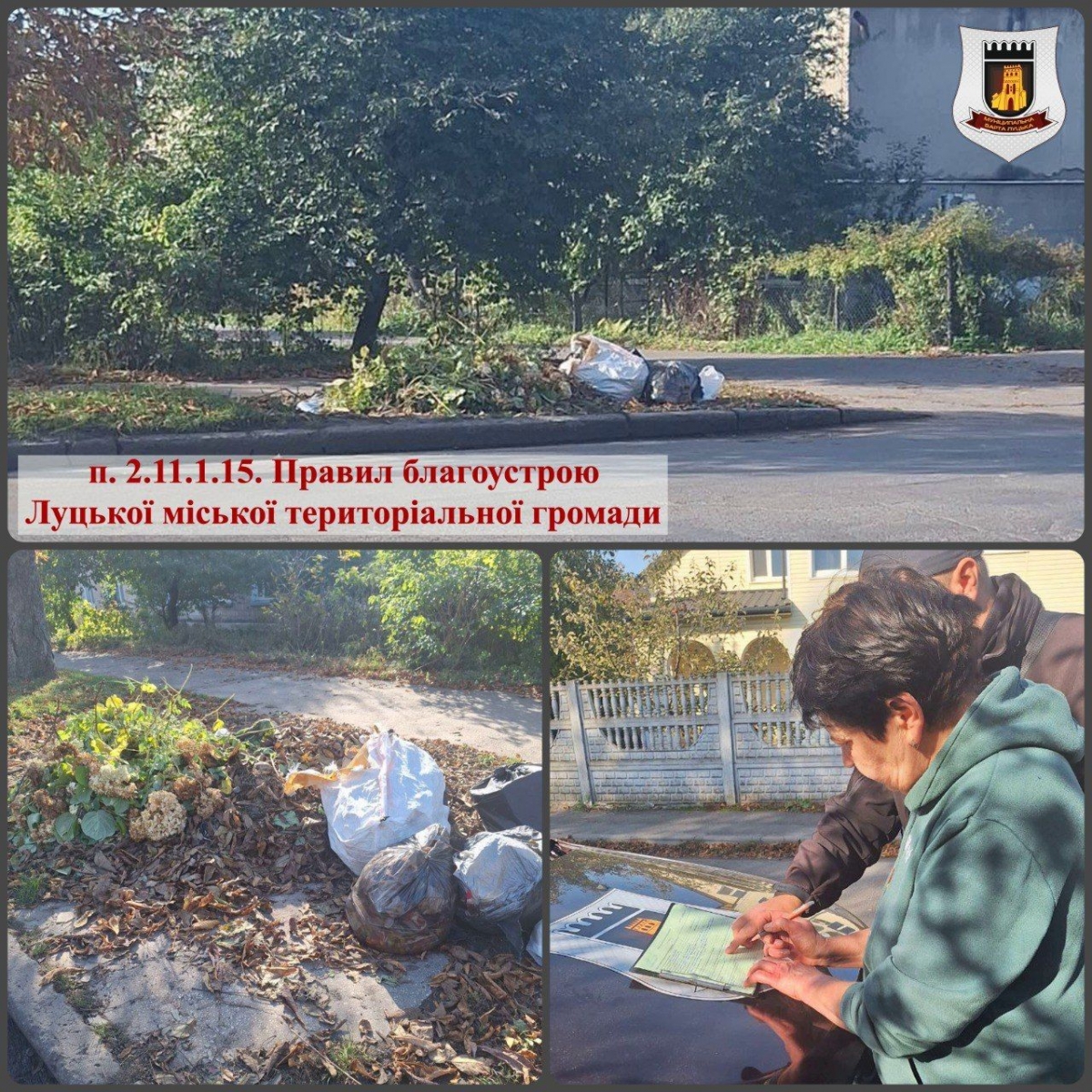 Інспекторами відділу контролю за благоустроєм та санітарним станом міста департаменту муніципальної варти Луцької міської ради в ході реагування на звернення виявили особу, яка викидала листя зі свого подвір’я на територію загального користування на вулиці Потебні.