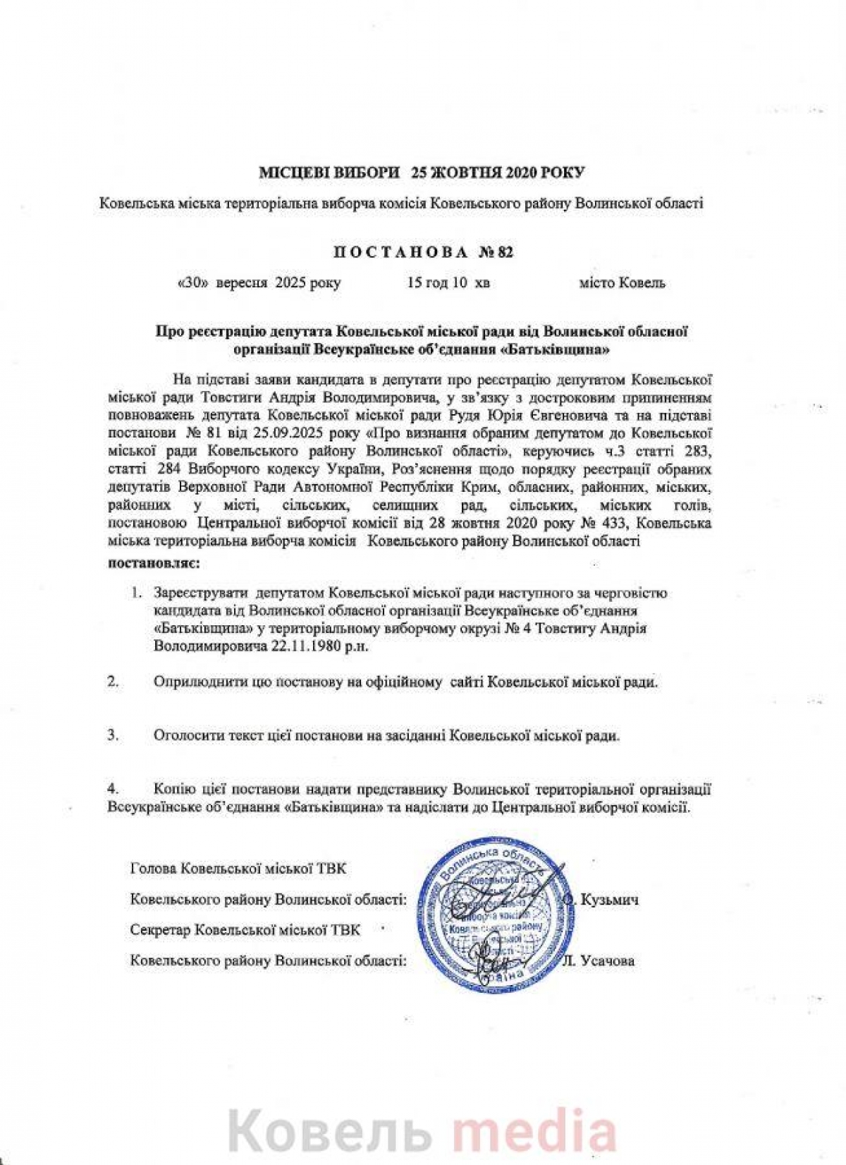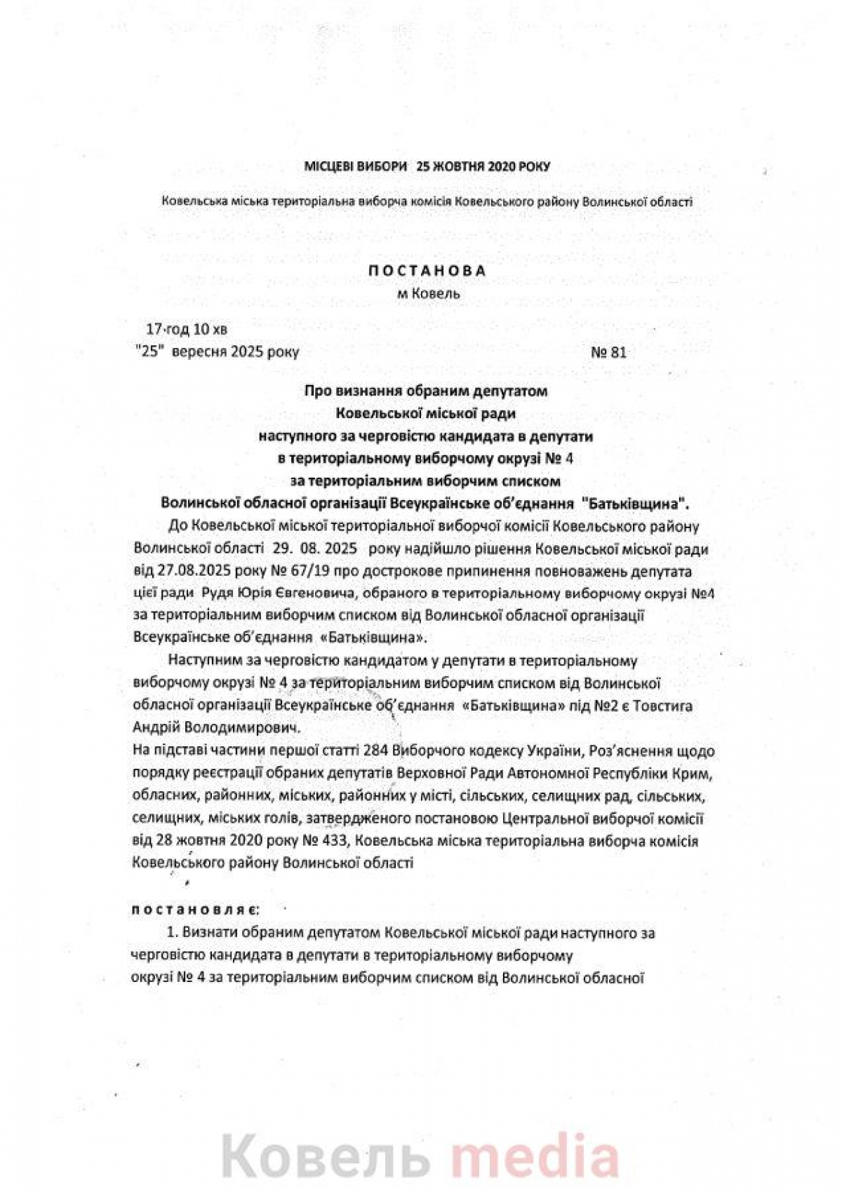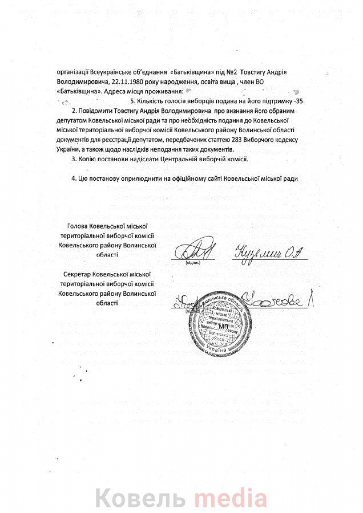 Згідно з постановою Ковельської міської територіальної виборчої комісії визнано обраним депутатом Ковельської міської ради Андрія Товстигу. Він має замінити у сесійній залі лікаря Юрія Рудя, який отримав 7 років позбавлення волі.