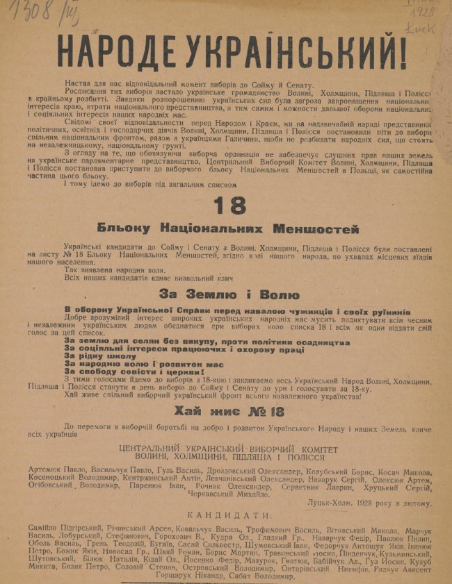 Свідомі своєї відповідальності перед Народом і Краєм, ми на надзвичайній нараді представників політичних, освітніх і господарчих діячів Волині, Холмщини, Підляша і Полісся постановили піти до виборів спільним національним фронтом, разом з українцями Галичини, щоби не розбивати народних сил, що стоять на незалежницькому, національному грунті". - йшлось у листівці.